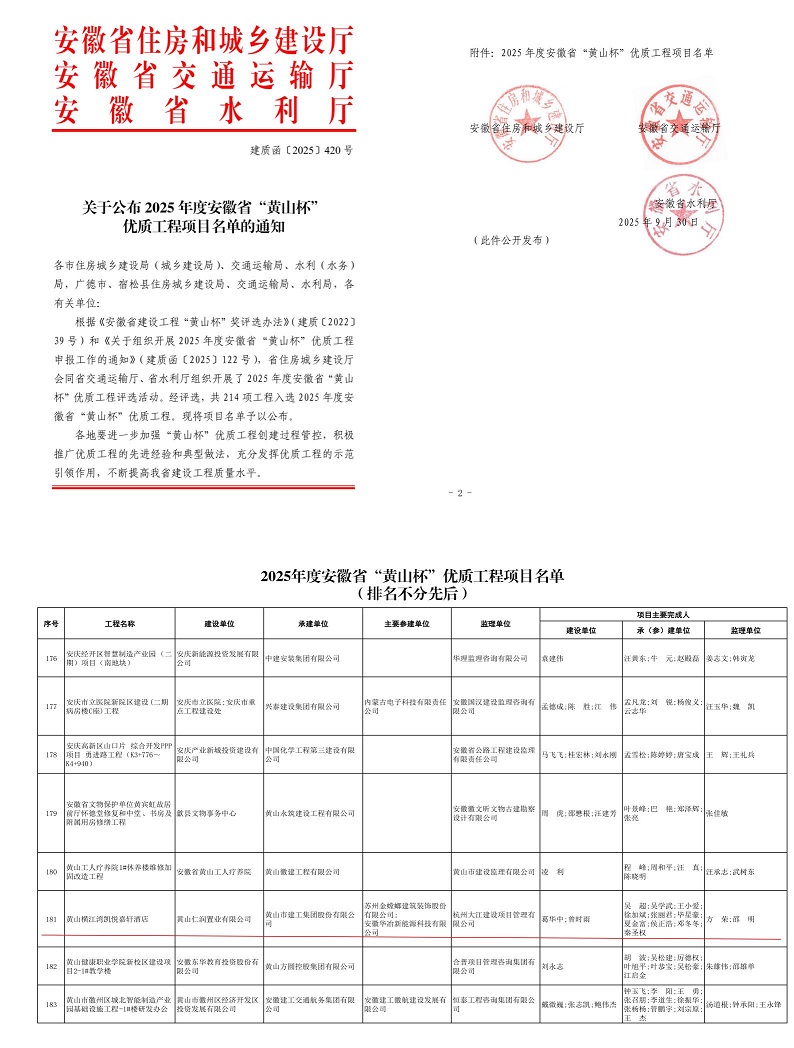 近日,安徽省住房和城鄉(xiāng)建設(shè)廳、安徽省交通運(yùn)輸廳、安徽省水利廳聯(lián)合公布了2025年度省“黃山杯”優(yōu)質(zhì)工程項目名單,黃山市建工集團(tuán)承建的黃山橫江灣凱悅嘉軒酒店項目成功入選,榮膺安徽省建設(shè)工程質(zhì)量最高榮譽(yù)——“黃山杯”獎。