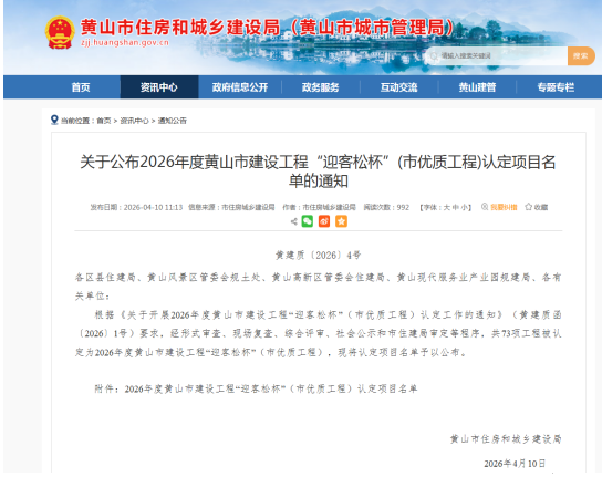 近日,黃山市住房和城鄉(xiāng)建設局正式發(fā)布《關于公布2026年度黃山市建設工程“迎客松杯”(市優(yōu)質工程)認定項目名單的通知》。由黃山建工集團承建的高鐵黟縣東站站前廣場及附屬配套工程、仙人洞南路東側D1地塊(文瀾軒)-4#樓以及黃山市南部城鎮(zhèn)群水務調度中心項目憑借過硬的施工質量和卓越的工程品質,成功通過最終審定,認定為2026年度黃山市建設工程“迎客松杯”(市優(yōu)質工程)。這也是集團連續(xù)多年獲得該殊榮。